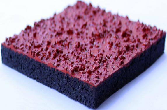 復合型跑道底層同透氣型跑道一樣,將彈性膠粒與聚氨酯粘合劑,采用攤鋪設備制成緩沖彈性層,厚度約10mm,然后用聚氨酯漿料加膠粉封住黑顆粒底層大約1mm厚左右;面層用聚氨酯膠漿加EPDM膠粒進行噴涂。
